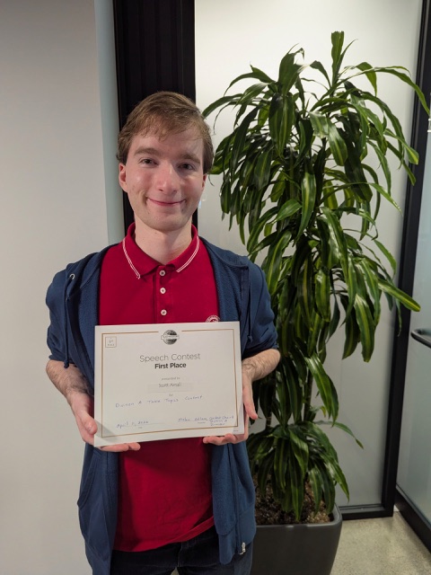 On Saturday, April 11th, several of our members attended the Division A Toastmasters contest to support Scott—and it paid off. Scott took first place in the Table Topics contest against a strong field of speakers.